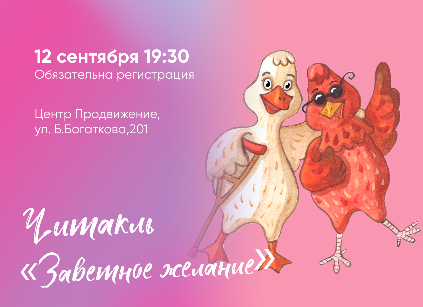 Театральное объединение «Билет в буфет» совместно с театром-студией «Рубикон» представляет читакль по мотивам книги Ульрих Хуб «Слепая курица, хромая утка». Мы приглашаем детей и их родителей, бабушек и дедушек, и всех, кто хочет узнать о настоящей дружбе в 19.00 в центр Продвижение…